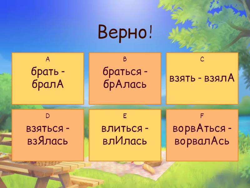 1) Верно! a) брать - бралА b) браться - брАлась c) взять - взялА d) взяться - взЯлась e) влиться - влИлась f) ворвАться - ворвалАсь 2) Верно! a) воспринЯть - воспринялА b) воссоздАть - воссоздалА c) вручИть- врУчит d) гнать - гнАла e) гнаться - гнАлась f) добрАть - добралА 3) Верно! a) дождАться - дождАлась b) дозвонИться - дозвонИтся c) дозИровать d) ждать - ждАла e) жИться - жилОсь f) закупОрить 4) Верно! a) занЯть - зАнял - занялА - зАняли b) заперЕть - зАперла c) запломбИровать d) защемИть - защемИт e) звать - звалА f) звонИть - звОнит 5) Верно! a) кАшлянуть b) класть - клАла c) клЕить d) крАсться - кралАсь e) кровотОчить f) лгать - лгалА 6) Верно! a) лить - лилА b) литься - лИлась c) наврАть - навралА d) наделИть - надЕлит e) надорваться - надорвалАсь f) назвАться - назвАлась 7) Верно! a) накрениться - накренИтся b) налить - налилА c) нарвАть - нарвАла d) начАть - начАл - нАчала - начАли e) обзвонИть - обзвонИт f) облЕгчить - облЕгчит 8) Верно! a) облИться - облИлась b) обнЯться - обнЯлась c) обогнАть - обогнАла d) ободрАть - ободралА e) ободрИть - ободрИт f) ободрИться - ободрИтся 9) Верно! a) обострИть b) одолжИть - одОлжит c) озлОбить d) оклЕить e) окружИть - окружИт f) опошлИть 10) Верно! a) освЕдомиться - освЕдомится b) отбЫть - отбылА c) отдАть - отдалА d) откУпорить e) отозвАть - отозвАла f) отозвАться - отозвАлась 11) Верно! a) перезвонИть - перезвонИт b) перелИть - перелИла c) плодоносИть d) пломбировАть e) повторИть - повторИт f) позвАть - позвАла 12) Верно! a) позвонИть - позвонИт b) полИть - полИла c) положИть - положИл -  d) понЯть - понялА e) послАть - послАла f) прибыть - прибЫл - прИбыла - прибылИ 13) Верно! a) принЯть - прИнял - принялА - прИняли b) рвать - рвАла c) сверлИть - свЕрлит d) снять - снЯла e) соврАть - соврАла f) создАть - создалА 14) Верно! a) сорвАть - сорвалА b) сорИть - сорИт c) убрАть - убрАла d) углубИть e) укрепИть - укрепИт f) черпАть 15) Верно! a) щемИть - щемИт b) щёлкать