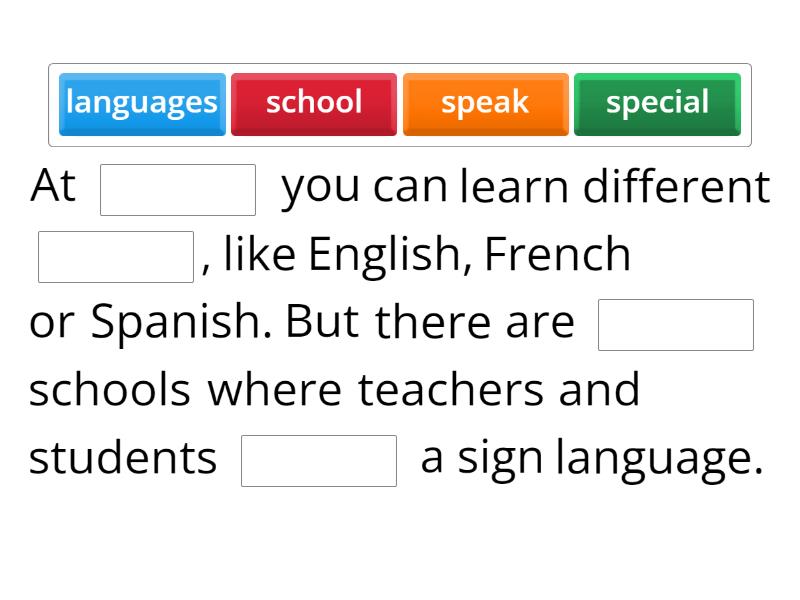 At ____ you can learn different ____, like English, French or Spanish. But there are ____ schools where teachers and students ____ a sign language. In ____ language you can make letters and words with your ____. It's for people who can't ____. There are different sign languages and different sign language ____. Sign language is ____ in schools and at home. All the family can ____ sign language. They can speak to children who ____ hear. Some TV programmes are in sign ____ too. Are there ____ at your school who can't ____ You ____ learn sign language and make ____ with them. There are sign language ____