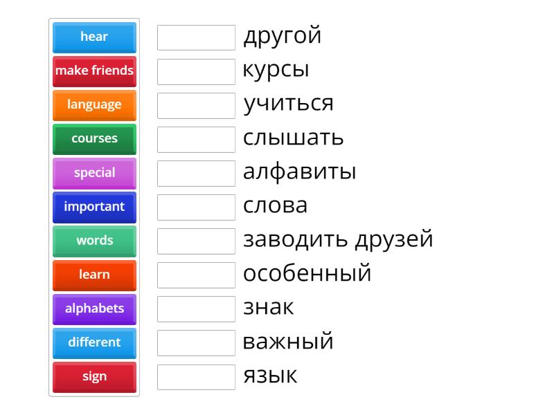 learn - учиться, different - другой, special - особенный, sign - знак, words - слова, hear - слышать, alphabets - алфавиты, important - важный, language - язык, make friends - заводить друзей, courses - курсы,