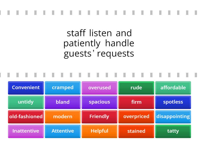 Attentive - staff listen and patiently handle guests’ requests, Friendly - staff make guests feel welcome and go the extra mile to help, Helpful - staff give advice and offer solutions, rude - staff have bad manners and aren’t polite, Inattentive - don’t listen to people or respond to their requests, spotless - When a room is at its ultimate level of cleanliness, untidy - room is messy and not very organised, stained - surfaces like carpets or sheets have unremovable marks, spacious - room, allowing to move freely and relax., cramped - room is small and offers little room to move, old-fashioned - a place or furnishings that are not of recent style and probably need changing., modern - keeps up with contemporary design trends, creating a fresh atmosphere, tatty - uncomfortable, overused - having been used a lot, Convenient - a place has everything guests need, affordable - the price is fair and easy to afford, overpriced - expensive and has poor value for money, bland - has little taste or flavour, disappointing - not as good as we thought it would be and has, therefore, left us with a negative impression., firm - solid and not too soft,