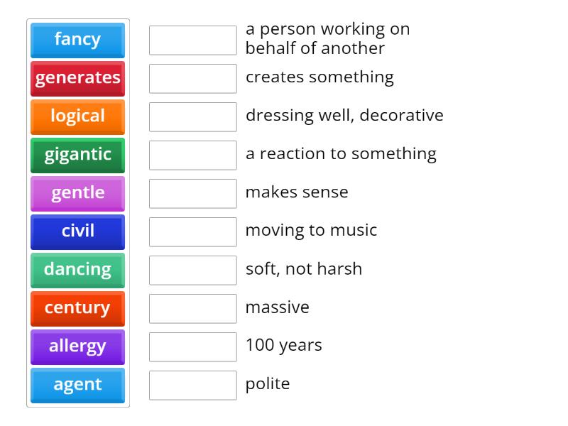 gentle - soft, not harsh, fancy - dressing well, decorative, dancing - moving to music, century - 100 years, gigantic - massive, allergy - a reaction to something, civil - polite, generates - creates something, agent - a person working on behalf of another, logical - makes sense,
