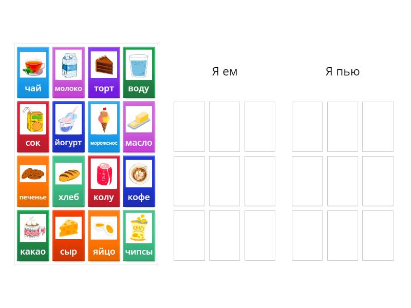 Я ем: печенье, сыр, мороженое, хлеб, йогурт, яйцо, торт, масло, чипсы, Я пью: колу, воду, молоко, сок, чай, какао, кофе,