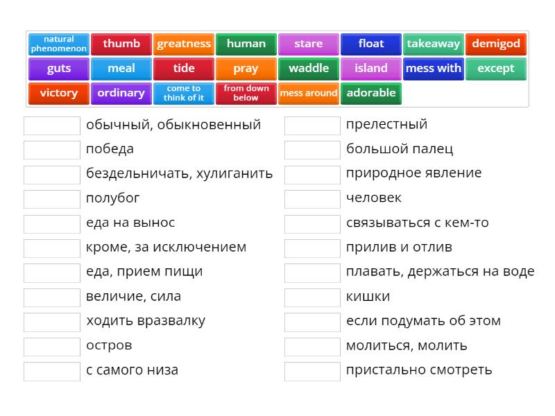 adorable - прелестный, human - человек, stare - пристально смотреть, greatness - величие, сила, demigod - полубог, ordinary - обычный, обыкновенный, from down below - с самого низа, except - кроме, за исключением, island - остров, pray - молиться, молить, come to think of it - если подумать об этом, natural phenomenon - природное явление, mess around - бездельничать, хулиганить, meal - еда, прием пищи, guts - кишки, takeaway - еда на вынос, mess with - связываться с кем-то, victory - победа, float - плавать, держаться на воде, tide - прилив и отлив, thumb - большой палец, waddle - ходить вразвалку,