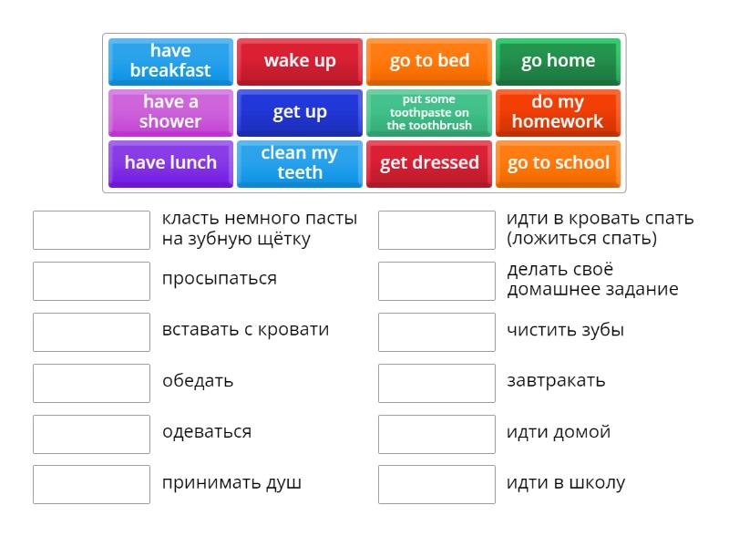 go to school - идти в школу, go home - идти домой, do my homework - делать своё домашнее задание, go to bed - идти в кровать спать (ложиться спать), clean my teeth - чистить зубы, wake up - просыпаться, get up - вставать с кровати, put some toothpaste on the toothbrush - класть немного пасты на зубную щётку, have breakfast - завтракать, have lunch - обедать, have a shower - принимать душ, get dressed - одеваться,