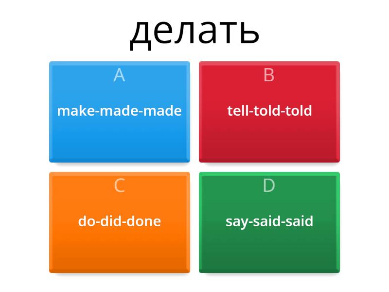 1) делать a) make-made-made b) tell-told-told c) do-did-done d) say-said-said 2) бегать a) swim-swam-swum b) run-ran-run c) do-did-done d) pay-paid-paid 3) идти, ехать a) run-ran-run b) teach-taught-taught c) go-went-gone d) feed-fed-fed 4) быть a) sell-sold-sold b) drive-drove-driven c) be-was/were-been d) meet-met-met 5) ломать a) do-did-done b) catch-caught-caught c) break-broke-broken d) pay-paid-paid 6) покупать a) buy-bought-bought b) sit-sat-sat c) meet-met-met d) do-did-done 7) рисовать a) draw-drew-drawn b) sell-sold-sold c) go-went-gone d) run-ran-run 8) пить a) sell-sold-sold b) pay-paid-paid c) ride-rode-ridden d) drink-drank-drunk 9) кушать a) buy-bought-bought b) eat-ate-eaten c) sit-sat-sat d) have-had-had 10) давать a) ride-rode-ridden b) teach-taught-taught c) give-gave-given d) catch-caught-caught 11) иметь a) run-ran-run b) meet-met-met c) teach-taught-taught d) have-had-had 12) делать (руками) a) teach-taught-taught b) tell-told-told c) make-made-made d) catch-caught-caught 13) видеть a) see-saw-seen b) tell-told-told c) say-said-said d) drive-drove-driven 14) брать a) take-took-taken b) pay-paid-paid c) ride-rode-ridden d) teach-taught-taught 15) носить (одежду) a) sit-sat-sat b) make-made-made c) wear-wore-worn d) teach-taught-taught 16) выигрывать a) feed-fed-fed b) win-won-won c) swim-swam-swum d) do-did-done 17) писать a) wear-wore-worn b) take-took-taken c) see-saw-seen d) write-wrote-written