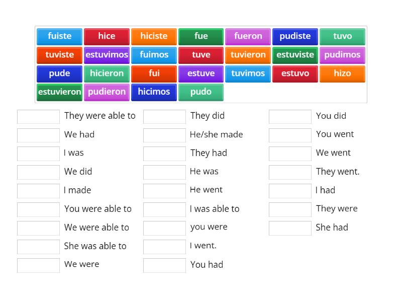 hizo - He/she made, fui - I went., pudieron - They were able to, hice - I made, hiciste - You did, hicimos - We did, hicieron - They did, pude - I was able to, pudiste - You were able to, pudo - She was able to, pudimos - We were able to, tuve - I had, tuviste - You had, tuvo - She had, tuvimos - We had, tuvieron - They had, estuve - I was, estuviste - you were, estuvo - He was, estuvimos - We were, estuvieron - They were, fuiste - You went, fue - He went, fuimos - We went, fueron - They went.,
