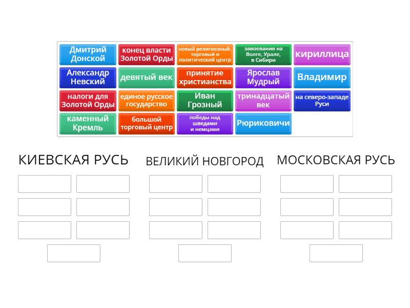 КИЕВСКАЯ РУСЬ: девятый век, Рюриковичи, принятие христианства, Владимир, Ярослав Мудрый, кириллица, ВЕЛИКИЙ НОВГОРОД: на северо-западе Руси, большой торговый центр, тринадцатый век, Александр Невский, победы над шведами и немцами, налоги для Золотой Орды, МОСКОВСКАЯ РУСЬ: новый религиозный, торговый и политический центр, Дмитрий Донской, каменный Кремль, конец власти Золотой Орды, единое русское государство, Иван Грозный, завоевания на Волге, Урале, в Сибири,