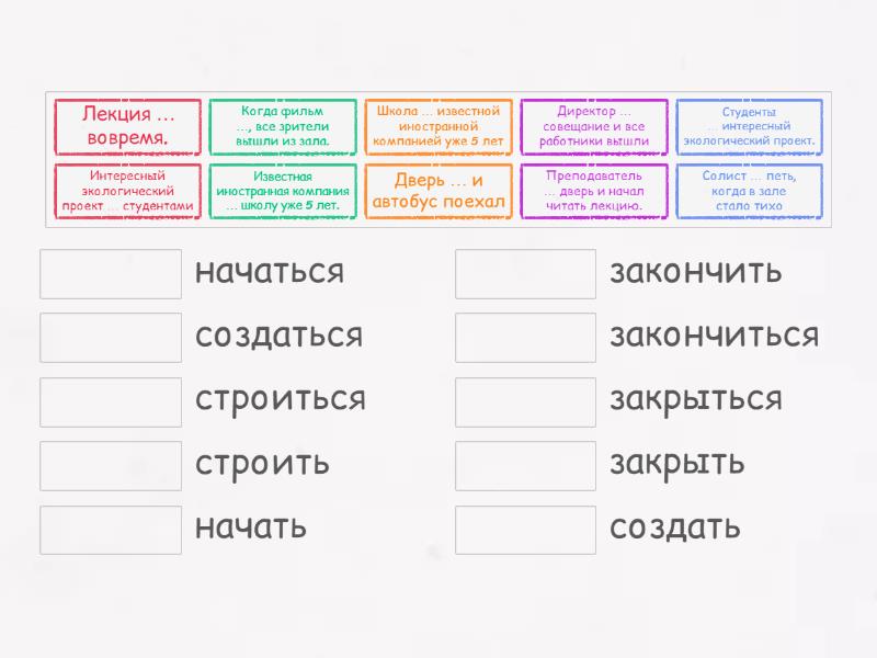 Известная иностранная компания … школу уже 5 лет.  - строить, Школа … известной иностранной компанией уже 5 лет - строиться, Студенты … интересный экологический проект. - создать , Интересный экологический проект … студентами - создаться, Преподаватель … дверь и начал читать лекцию. - закрыть, Дверь … и автобус поехал - закрыться, Лекция … вовремя. - начаться, Солист … петь, когда в зале стало тихо - начать, Когда фильм …, все зрители вышли из зала. - закончиться, Директор … совещание и все работники вышли - закончить,