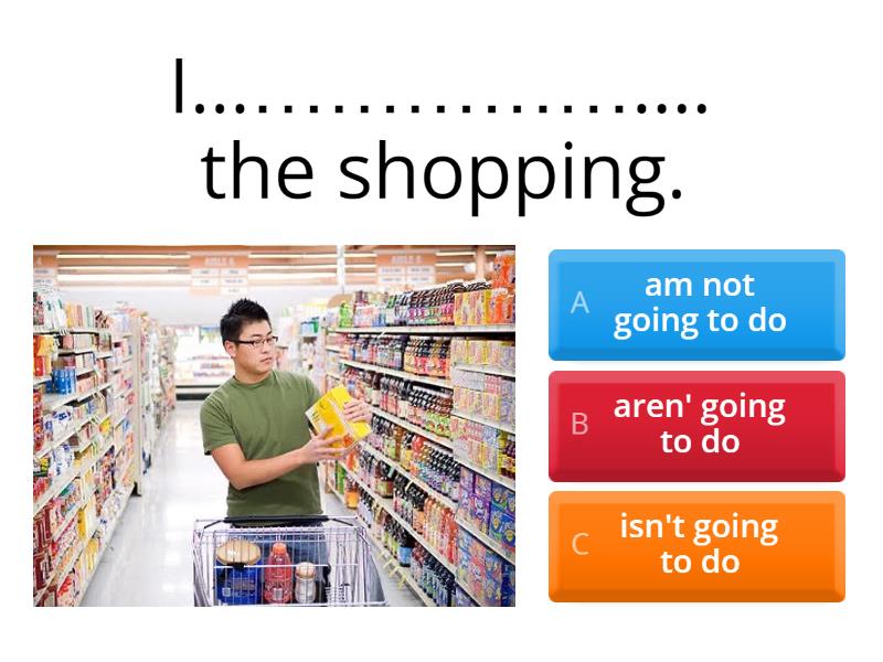 1) I...…………….... in a restaurant. a) am going to eat b) going to eat c) is going to eat 2) Sam...…………….... pizza. a) am having b) is going to have c) are going to have 3) I...…………….... the shopping. a) am not going to do b) aren' going to do c) isn't going to do 4) Sam and Megan...…………….... at home today. a) is going to eat b) am going to eat c) are going to eat 5) They ...…………….... pizza. a) am not going to have b) isn't going to have c) aren't going to have 6) I...…………….... football this afternoon. a) aren't to play b) am not going to play c) isn't going to play 7) We...…………….... today. a) going to practice b) are going to practice c) is going to practice 8) My sister ..................... the piano. a) is going to play b) are going to play c) am going to play