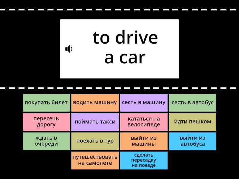 водить машину - to drive a car, покупать билет - to buy a ticket, сделать пересадку на поезде - to change trains, идти пешком - to go on foot, пересечь дорогу - to cross the road, сесть в машину - to get into the car, выйти из машины - to get out of the car, сесть в автобус - to get on bus, выйти из автобуса - to get off bus, поехать в тур - to go on tour, кататься на велосипеде - to ride a bike , поймать такси - to take a taxi, путешествовать на самолете - to travel by plane, ждать в очереди - to wait in queue,