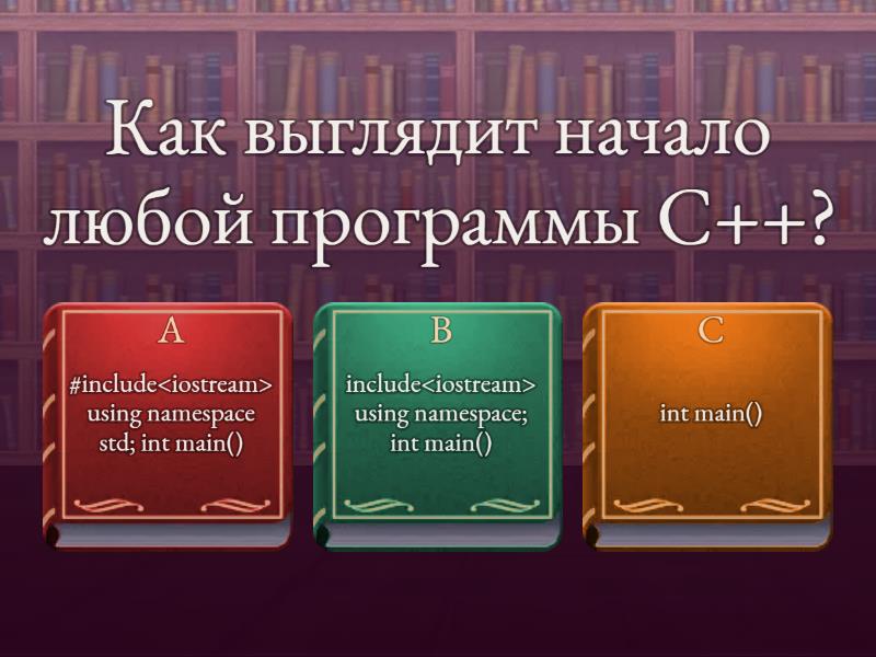 1) Как выглядит начало любой программы С++? a) #include<iostream> using namespace std; int main() b) include<iostream> using namespace; int main() c) int main() 2) Как выглядит функция ввода? a) int x; cin << x; b) int x; cin >> x; c) int x; cin x; 3) Как выглядит функция вывода? a) int x; cin >> x; cout << x; b) int x; cout << x; c) int x; cin >>x; cout >> x; 4) Выберите условные операторы a) while b) else c) continue d) for e) switch 5) Где правильно указана переменная? a) float x = 32,14; b) var str = "Hi"; c) int num = "1"; d) char sym = 'a'; e) done = true; 6) Какое утверждение про циклы верное? a) В цикле for может быть только один счетчик b) Цикл for не может быть бесконечным c) Цикл while может быть не выполнен ни разу 7) Как правильно объявить переменную? a) string text="text"; b) char text[]="text"; c) char text[]='text'; 8) Где процессор будет искать файл #include? a) Во всех папках включения файлов b) В глобальных по отношению к проекту папках включения файлов c) В локальных по отношению к проекту папках включения файлов 9) Что такое директивы препроцессора? a) Указание компилятору выполнить то или иное действие в момент компиляции программы b) Дерево папок и файлов программы c) Способ добавления библиотеки в программу 10) Как закончить ввод строки при способе ввода cin>>g>>t>>n;? a) Ввести \n b) Ввести пробел или Enter c) Нажать Enter 11) Какое утверждение верно? a) Размер переменной типа bool меньше, чем типа char b) Переменная типа float занимает столько же места, как и double c) Размер переменной типа char равен единице 12) Можно ли перегружать операции для встроенных типов данных? a) Нет b) Да 13) Какие основные области применения языка С++?cout << a; a) системное программирование b) прикладное программирование c) программирование дизайна сайтов 14) Программа на языке С++ начинает выполняться с: a) первой функции в программе b) той функции, которая указана как стартовая при компиляции программы c) функции main 15) Комментарий в программе на С++ a) содержит пояснения к тексту и не оказывает влияния на выполнение программы b) содержит указания компилятору по настройке программы c) должен содержать допустимые аргументы программы 16) При выходе из функции main... a) программа заканчивается b) программа повторяется с теми же аргументами c) выполняется функция finish, определенная программистом 17) Отметьте истинные высказывания: a) функция main может иметь несколько аргументов b) функция main должна иметь как минимум один аргумент c) функция main может не иметь аргументов 18) Ключевое слово void обозначает что функция... a) возвращает число с плавающей запятой b) ничего не возвращает c) возвращает целое число d) является главной 19) Какими по умолчанию объявляются методы класса? a) private b) protected c) public d) по умолчанию не объявляются 20) Какие из перечисленных типов являются встроенными типами языка С++? a) float b) integer c) real d) bool 21) Что целесообразно определять в public разделе класса? a) все, чтобы уберечь себя от ошибок b) все невиртуальные методы c) все, что относится к интерфейсу класса 22) Что произойдет, если определение класса будет находиться в файле в двух местах? a) будет использоваться второе определение b) зависит от других факторов c) ошибка произойдет при сборке программы из нескольких файлов d) второе определение будет проигнорировано e) ошибка компиляции 23) Операция ++ a) уменьшает значение переменной на единицу b) в языке Си++ не существует c) увеличивает значение переменной на два d) уменьшает значение переменной на два e) увеличивает значение переменной на единицу 24) Что означает запись for (;;);? a) бесконечный цикл b) ошибка компиляции c) цикл, кото