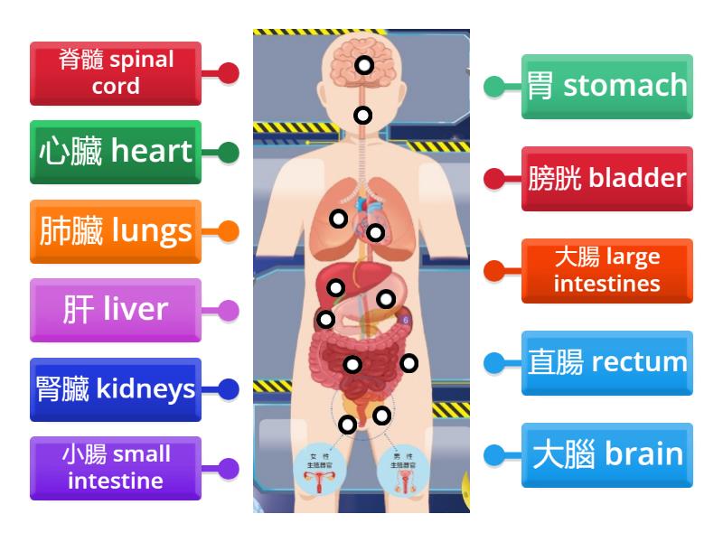 大腦 brain, 脊髓 spinal cord, 肺臟 lungs, 心臟 heart, 肝 liver, 腎臟 kidneys, 胃 stomach, 大腸 large intestines, 小腸 small intestine, 直腸 rectum, 膀胱 bladder.