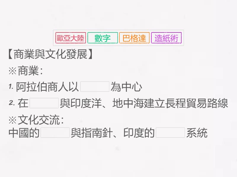 【商業與文化發展】 ※商業: 1. 阿拉伯商人以____為中心 2. 在____與印度洋、地中海建立長程貿易路線 ※文化交流: 中國的____與指南針、印度的____系統 【商業與文化發展】 ※文化保存: 1. 翻譯____、羅馬典籍,建立學校與____保存文獻 2. 為歐洲文藝復興奠定基礎 ※文學: 《____》反映巴格達繁榮的城市風貌 【土耳其人崛起】 ※塞爾柱土耳其人: 1. 十一世紀時,取代____控制西亞 2. 發展對基督教勢力造成威脅,導致多次____戰爭 ※鄂圖曼帝國: 1. 十四世紀以後迅速擴張,並在過程中攻滅____ 2. 建立橫跨歐、亞、非三洲的鄂圖曼帝國