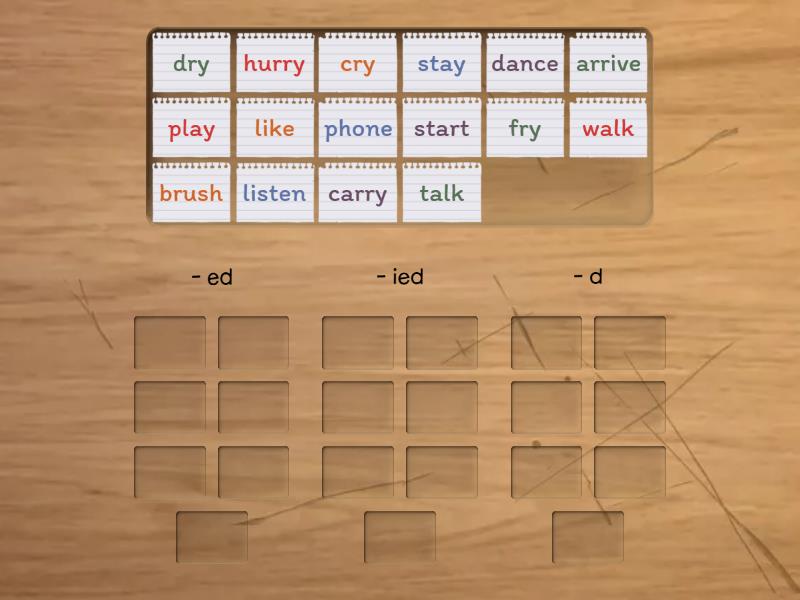 - ed: listen, play, stay, brush, walk, talk, start, - ied: fry, hurry, carry, dry, cry, - d : phone, dance, arrive, like,