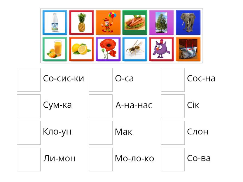 Со-ва, О-са, Сік, Сос-на, Кло-ун, Мо-ло-ко, Слон, Сум-ка, А-на-нас, Мак, Ли-мон, Со-сис-ки,