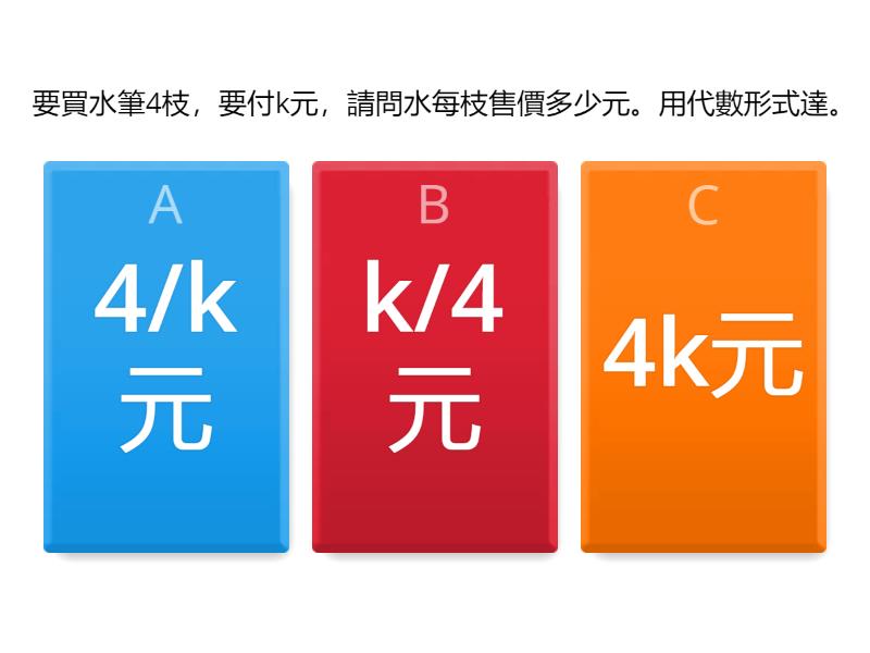 1) 要買水筆4枝,要付k元,請問水每枝售價多少元。用代數形式達。 a) 4/k 元 b) k/4 元 c) 4k元 2) 果汁每包m元,付20元,請用程式表示。 a) 應找回(m-20)元 b) 應找回(20+m)元 c) 應找回(20-m元