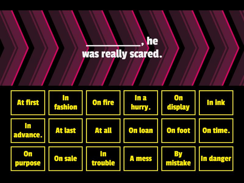At first - ___________, he was really scared., At last - I've finished my essay __________!, At all - Robin never really liked him ______, By mistake - She put salt into her coffee _______, In ink - Write your homework ___________ ,not in pencil., In trouble - He was _________ with his teachers., In a hurry. - She swallowed down her breakfast__________, In danger - You are ____________ of catching cold., On display - The painting is now________ at the National Gallery in London., In advance. - It's cheaper if you book the tickets ___________, On foot - We decided to go ___________, On fire - A candle had set the curtains ____________, On loan - It's not my book I've got it _____________ from the library., On sale - He bought a sports jacket __________ at the store., On time. - The buses don't come _________, A mess - Your room is in ____________. Please tidy it., In fashion - Long hair is back _________ for men., On purpose - I didn't do it _________ - it was an accident.,