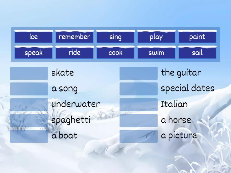 cook  - spaghetti, paint - a picture, play - the guitar, remember  - special dates, ride - a horse, sail  - a boat, sing  - a song, ice - skate, speak  - Italian, swim - underwater,
