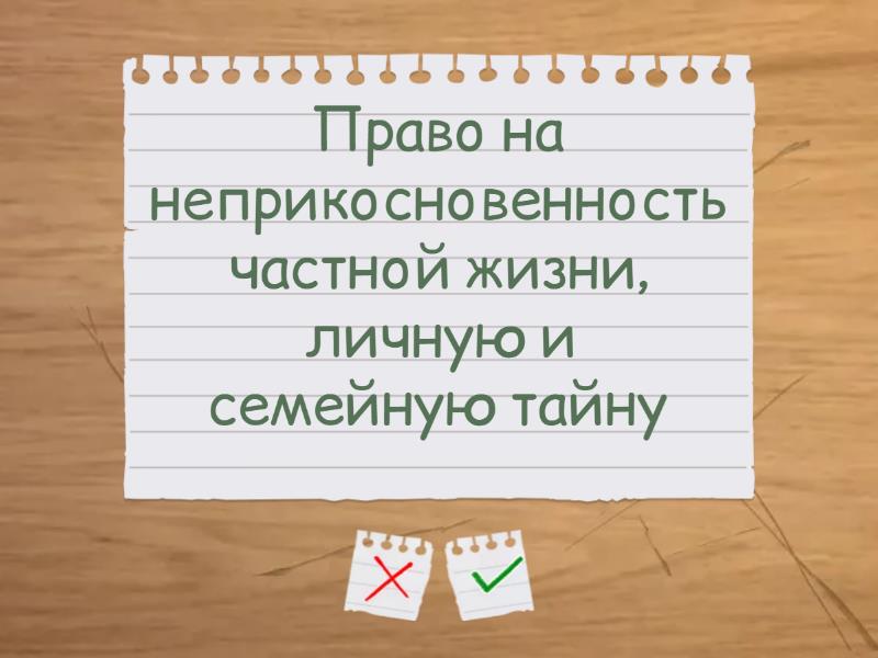 Право на неприкосновенность жилища - Личное (гражданское) право, Право на государственную защиту материнства и детства и семьи - Социально-экономическое право, Право на жизнь - Личное (гражданское) право, Достоинство личности охраняется государством. Никто не может быть основанием для его умаления - Личное (гражданское) право, Право на неприкосновенность частной жизни, личную и семейную тайну - Личное (гражданское) право, Право на отдых - Социально-экономическое право, Право свободно определять и указывать свою национальную принадлежность - Личное (гражданское) право, Право избирать и быть избранным - Политическое право, Право на свободу совести и свободу вероисповедания - Личное (гражданское) право, Право частной собственности и право наследования - Социально-экономическое право, Право на охрану здоровья и медицинскую помощь - Социально-экономическое право, Право на объединение, свобода собраний, митингов, демонстраций, шествий, пикетирования - Политическое право, Свобода мысли и слова - Личное (гражданское) право,