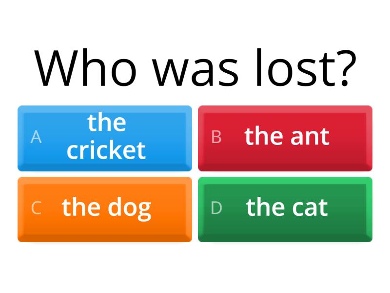 1) Who was lost? a) the cricket b) the ant c) the dog d) the cat 2) What was the ant looking for? a) his sister b) his dog c) his nest d) his dinner 3) What was the name of the story? a) Found b) Hide c) Lost d) Look 4) Who helped the ant find his nest? a) the spider b) the fly c) the snake d) the cricket 5) What is the title of this story? a) Sarah's Big Sister b) Suli's Big Race c) Sophie's Little Walk d) Sean's Small Sandwich 6) Little Suli is what animal? a) tiger b) zebra c) monkey d) elephant 7) Who had long legs? a) Taz the cheetah b) Suli the elephant c) Suzy the snake d) Alex the panda 8) Slowcoach means to....... a) draw really well b) run/walk very slowly c) speak English very well d) happy 9) Who won the race? a) Suli b) Taz 10) What is the name of this story? a) The spider chicken b) The Apple Fairy c) The Pumpkin Monster d) The Banana Man 11) What happened the Pumpkin? a) It grew bigger and bigger b) It burst c) It shrunk d) It melted 12) What did the Pumpkin Monster want? a) clothes b) food c) a bicycle d) a dog 13) What made the Pumpkin Monster go "Psssssssst" a) grass b) sharp thorns c) corn d) ice cream 14) Where did Omar and his class go? a) Zoo b) Museum c) Water park d) Supermarket 15) What museum did they got to? a) car museum b) clothes museum c) train museum d) toy museum 16) How many bones does a horse have? a) 100 b) 205 c) 300 d) 400 17) What did Beno play with? a) yo-yo b) car c) horse d) doll 18) What is the title of the story? a) It's Much Too Long b) It's Much Too Early c) It's Much Too Late d) It's Much Too Old 19) What did Jamal get for his birthday? a) computer b) bicycle c) scooter d) shoes 20) What did Jamal's family say to him? a) go back to bed b) go outside c) eat your breakfast d) get dressed 21) Why could Jamal not sleep? a) It was his birthday, he was excited b) He was sick c) He was sad d) He had no bed to sleep in