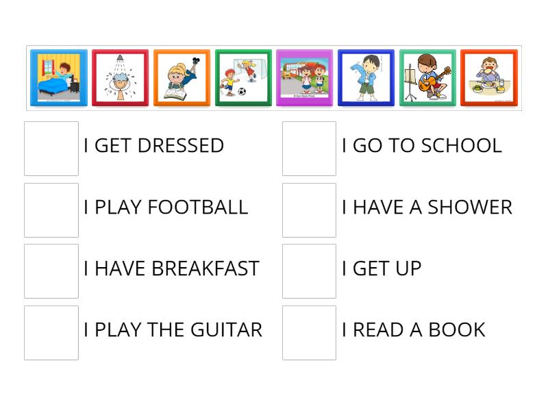 I HAVE BREAKFAST, I GO TO SCHOOL, I GET UP, I GET DRESSED, I HAVE A SHOWER, I READ A BOOK, I PLAY FOOTBALL, I PLAY THE GUITAR,