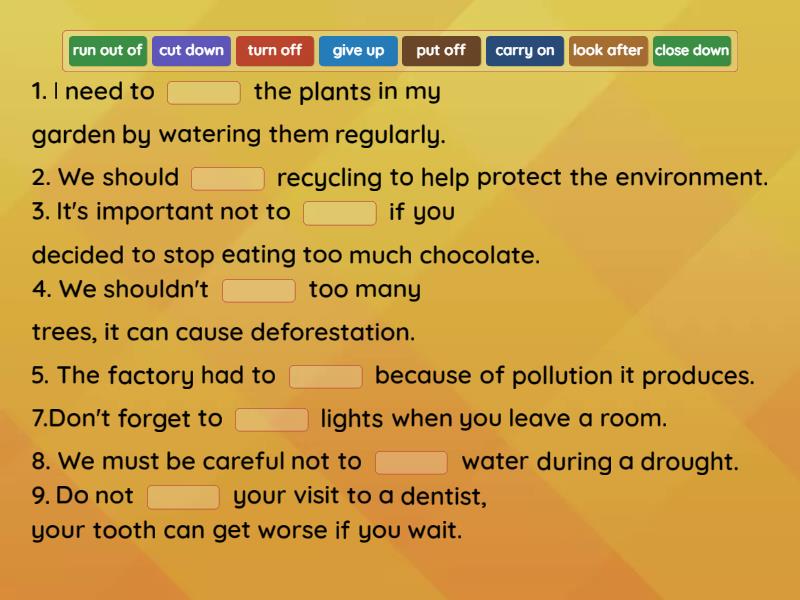 1. I need to ____ the plants in my garden by watering them regularly. 2. We should ____ recycling to help protect the environment. 3. It's important not to ____ if you decided to stop eating too much chocolate. 4. We shouldn't ____ too many trees, it can cause deforestation. 5. The factory had to ____ because of pollution it produces. 7.Don't forget to ____ lights when you leave a room. 8. We must be careful not to ____ water during a drought. 9. Do not ____ your visit to a dentist, your tooth can get worse if you wait.
