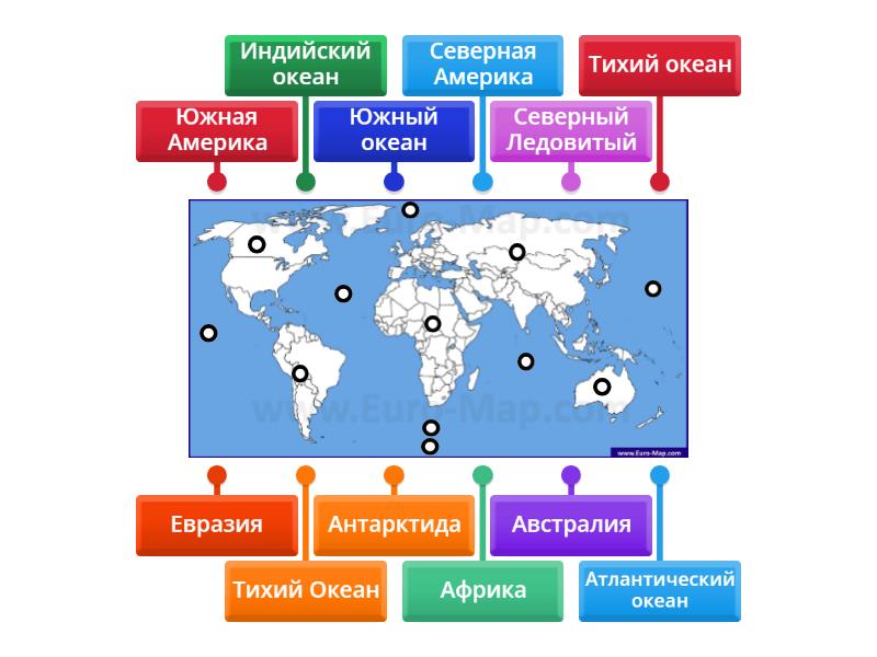 Атлантический океан, Тихий океан, Тихий Океан, Индийский океан, Северный Ледовитый, Южный океан, Африка, Евразия, Австралия, Северная Америка, Южная Америка, Антарктида.