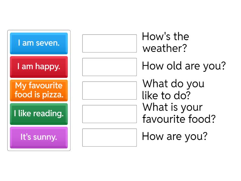 I like reading. - What do you like to do?, I am happy. - How are you?, I am seven. - How old are you?, It's sunny. - How's the weather?, My favourite food is pizza. - What is your favourite food?,