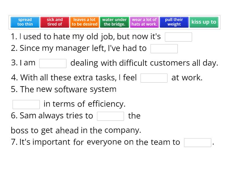1. I used to hate my old job, but now it's ____ 2. Since my manager left, I've had to ____ 3. I am ____ dealing with difficult customers all day. 4. With all these extra tasks, I feel ____ at work. 5. The new software system ____ in terms of efficiency. 6. Sam always tries to ____ the boss to get ahead in the company. 7. It's important for everyone on the team to ____. 8. I have to ____ when my coworker is out sick. 9. Working at this place feels like a ____ sometimes. 10. Let's ____ this project and move on to the next one. 11. The company's benefits package ____ 12. I deserve to ____ for all the hard work I do. 13. The report needs to ____, so I'm working overtime. 14. After months of searching, I finally decided to ____. 15. I'm going to ____ with better pay and benefits.