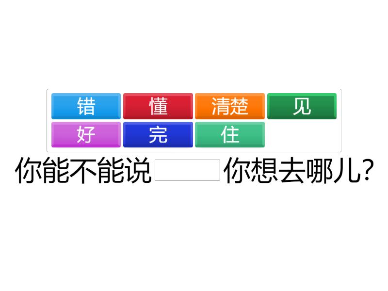 你能不能说____你想去哪儿? 你等我一会儿,我还没吃____。 对不起,我打____了电话。 我一直记不____这个汉字。 这些汉字太小了!我看不____。