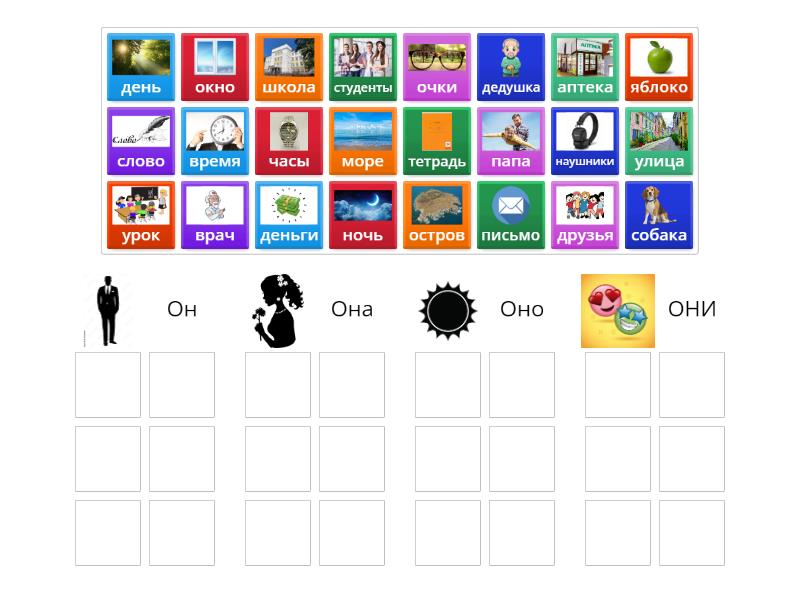 Он : остров, дедушка, день, урок, папа, врач, Она: собака, ночь, тетрадь, аптека, улица, школа, Оно : море, яблоко, время, письмо, окно, слово, ОНИ: студенты, очки, наушники, деньги, часы, друзья,