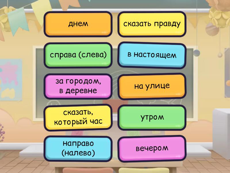 утром - in the morning, днем - in the afternoon, вечером - in the evening, за городом, в деревне - in the country, сказать правду - to tell the truth, сказать, который час - to tell the time, справа (слева) - on the right (left), направо (налево) - to the right (left), на улице - in the street, в настоящем - in the present,