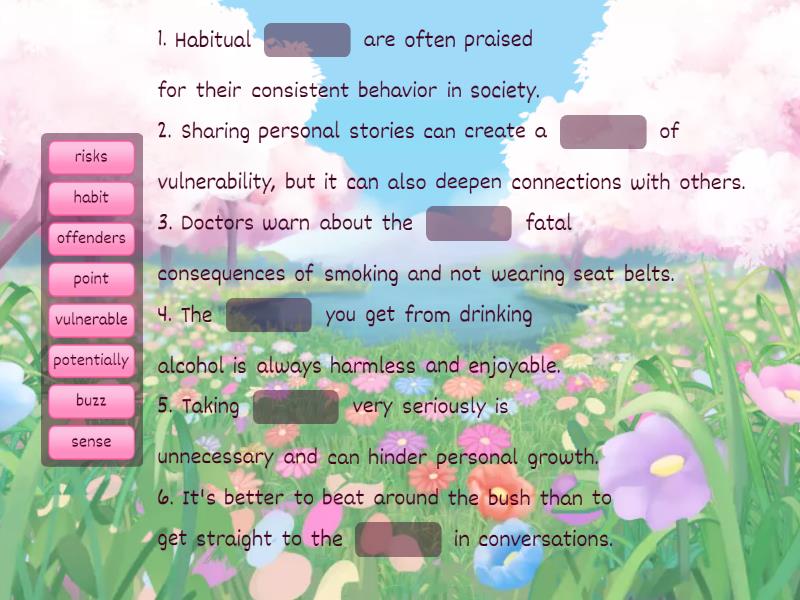1. Habitual ____ are often praised for their consistent behavior in society. 2. Sharing personal stories can create a ____ of vulnerability, but it can also deepen connections with others. 3. Doctors warn about the ____ fatal consequences of smoking and not wearing seat belts. 4. The ____ you get from drinking alcohol is always harmless and enjoyable. 5. Taking ____ very seriously is unnecessary and can hinder personal growth. 6. It's better to beat around the bush than to get straight to the ____ in conversations.