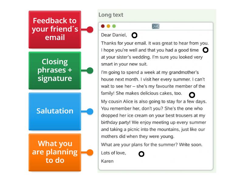 Salutation, Feedback to your friend´s email, What you are planning to do, Closing phrases + signature.