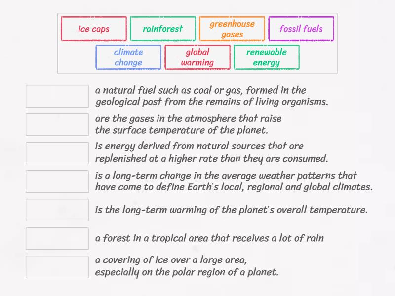 climate change - is a long-term change in the average weather patterns that have come to define Earth’s local, regional and global climates., fossil fuels - a natural fuel such as coal or gas, formed in the geological past from the remains of living organisms., global warming - is the long-term warming of the planet’s overall temperature., rainforest - a forest in a tropical area that receives a lot of rain, renewable energy - is energy derived from natural sources that are replenished at a higher rate than they are consumed., ice caps - a covering of ice over a large area, especially on the polar region of a planet., greenhouse gases - are the gases in the atmosphere that raise the surface temperature of the planet.,