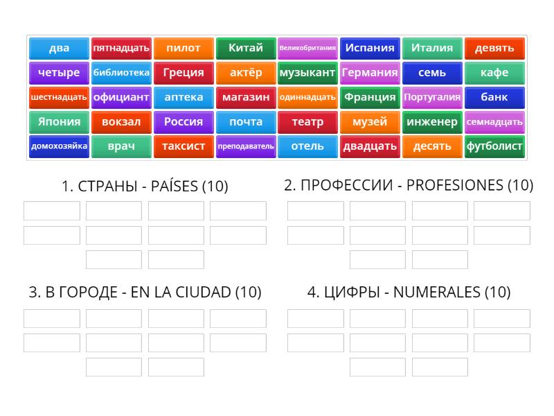 1. СТРАНЫ - PAÍSES (10): Россия , Испания, Франция, Великобритания, Португалия, Италия, Германия, Китай, Япония, Греция, 2. ПРОФЕССИИ - PROFESIONES (10): врач, инженер, домохозяйка, таксист, пилот, преподаватель, официант, музыкант, актёр, футболист, 3. В ГОРОДЕ - EN LA CIUDAD (10): банк, почта, библиотека, вокзал, кафе, музей, театр, отель, аптека, магазин, 4. ЦИФРЫ - NUMERALES (10): два, пятнадцать, семнадцать, одиннадцать, десять, семь, четыре, девять, шестнадцать, двадцать,