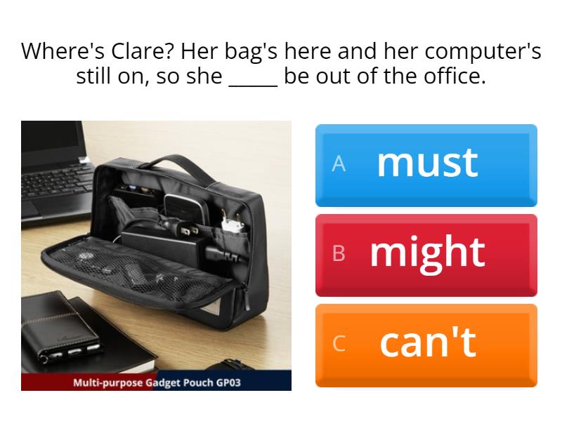 1) Where's Clare? Her bag's here and her computer's still on, so she _____ be out of the office. a) must b) might c) can't 2) I can't remember my password! But I think it _____ be written in my notebook as sometimes I do that. a) must b) could c) can't 3) Sorry, she's not here. She was feeling ill so she _____ be at the doctor's right now. a) must b) might c) can't 4) Wow! Are you going to eat all that? You _____ be really hungry! a) must b) might c) could 5) I don´t see anyone in the house. They ______ be out on holidays. a) can't b) could c) must 6) Paul _______ be in the library. It is closed. Who knows where he is? a) might b) could c) can't 7) You're kidding. That ____ be an authentic Rolex if you only paid 50 euros for it. a) must b) might c) can't 8) Look at the way that guy's walking. He__________ be drunk! a) can't b) must c) might 9) There's no reply. He__________ be out. a) could b) can't c) must 10) 'I've been working since 5 this morning and it's 10 in the evening now.' 'Oh, you _____ be exhausted!!!' a) must b) can't c) could 11) 'Wake up, Eliza, you have been sleeping all day! You _____ be tired!!!' a) might b) can't c) must 12) Alex _____ be at the doctor's. He said he was going to go one of these days a) could b) can't c) must
