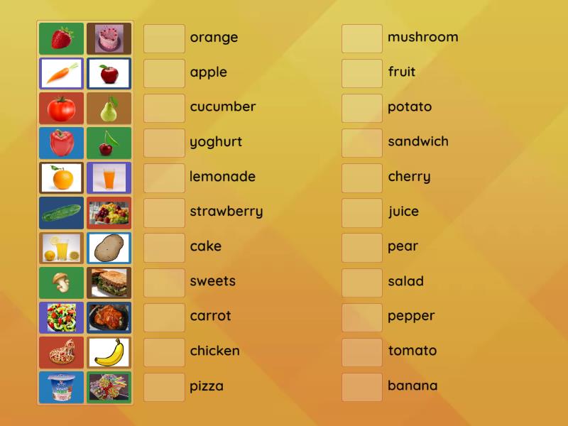 chicken, lemonade, juice, sweets, fruit, yoghurt, sandwich, cake, pizza, salad, apple, banana, pear, strawberry, cherry, orange, carrot, cucumber, mushroom, tomato, pepper, potato,