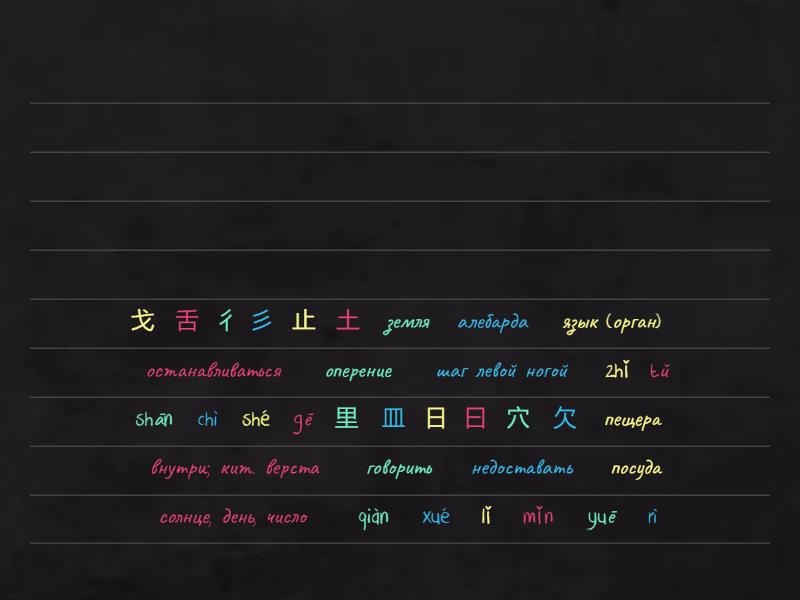 戈, 舌, 彳, 彡, 止, 土, земля, алебарда, язык (орган), останавливаться, оперение, шаг левой ногой, zhǐ, tǔ, shān, chì, shé, gē, 里, 皿, 日, 曰, 穴, 欠, пещера, внутри; кит. верста, говорить, недоставать, посуда, солнце, день, число, qiàn, xué, lǐ, mǐn, yuē, rì.