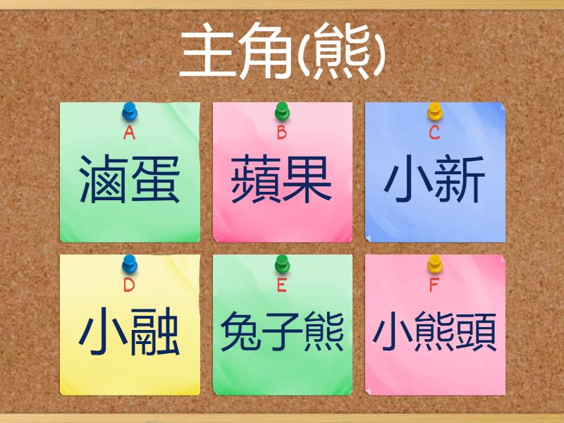 1) 主角(熊) a) 滷蛋 b) 蘋果 c) 小新 d) 小融 e) 兔子熊 f) 小熊頭 2) 主角(人) a) 滷蛋 b) 蘋果 c) 小新 d) 小融 e) 兔子熊 f) 小熊頭 3) 拿著蘋果(熊) a) 滷蛋 b) 蘋果 c) 小新 d) 小融 e) 兔子熊 f) 小熊頭 4) 穿兔子裝(熊) a) 滷蛋 b) 蘋果 c) 小新 d) 小融 e) 兔子熊 f) 小熊頭 5) 只有頭(熊) a) 滷蛋 b) 蘋果 c) 小新 d) 小融 e) 兔子熊 f) 小熊頭 6) 穿著睡衣(人) a) 滷蛋 b) 蘋果 c) 小新 d) 小融 e) 兔子熊 f) 小熊頭