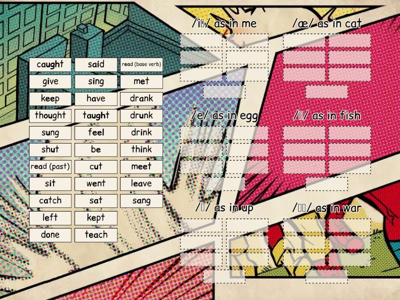 /iː/ as in me: keep, read (base verb), leave, meet, be, feel, teach, /æ/ as in cat: sat, have, drank, sang, catch, /e/ as in egg: kept, read (past), left, said, met, went, /ɪ/ as in fish: sit, give, drink, sing, think, /ʌ/ as in up: sung, cut, shut, drunk, done, /ɔː/ as in war: thought, taught, caught,
