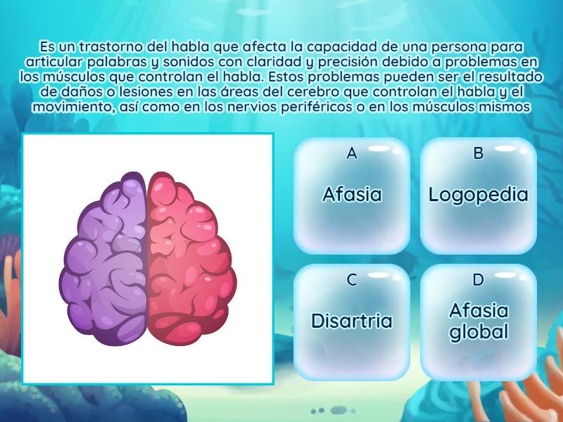 1) Es un trastorno del habla que afecta la capacidad de una persona para articular palabras y sonidos con claridad y precisión debido a problemas en los músculos que controlan el habla. Estos problemas pueden ser el resultado de daños o lesiones en las áreas del cerebro que controlan el habla y el movimiento, así como en los nervios periféricos o en los músculos mismos a) Afasia b) Logopedia c) Disartria d) Afasia global 2) Se produce por lesión de la circunvolución frontal inferior (área de Broca) izquierda y áreas adyacentes. Se caracteriza por dificultades para articular y el uso de frases cortas. a) Afasia mixta b) Afasia broca c) Afasia global d) Afasia Wernicke 3) Aparece como mutismo, y luego pronuncia palabras y frases sencillas. a) Afasia Wernicke b) Afasia global c) Afasia Broca d) Disartria 4) Causas de la disartria a) Covid-19 b) Tumor cerebral c) Gripe d) Migraña 5) Una característica de la disartria a) Arrastrar las palabras al hablar b) Problemas para leer c) Dificultad al llorar d) Habla claro 6) Una técnica para LA ATENCIÓN EDUCATIVA a) Darle su espacio y tiempo al estudiante para que procese la información y responda cuando se sienta capacitado. b) Incluirles léxico formal para que aprendan rápido. c) Hablarles rápido para que ellos entiendan mejor d) Utilizar el mismo planeamiento, pues no hay diferencia alguna del resto.