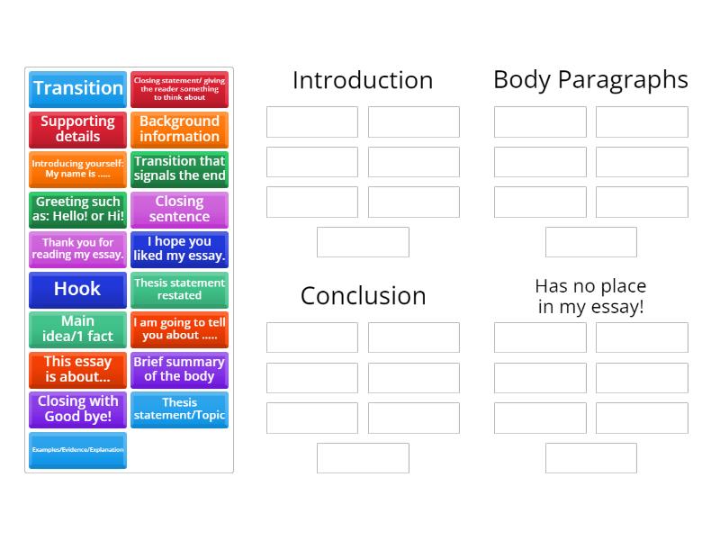 Introduction: Hook, Background information, Thesis statement/Topic, Body Paragraphs: Transition, Main idea/1 fact, Supporting details, Examples/Evidence/Explanation, Closing sentence, Conclusion: Transition that signals the end, Thesis statement restated, Brief summary of the body , Closing statement/ giving the reader something to think about, Has no place in my essay!: Greeting such as: Hello! or Hi!, Introducing yourself: My name is ....., I am going to tell you about ....., This essay is about..., Thank you for reading my essay., I hope you liked my essay., Closing with Good bye!,