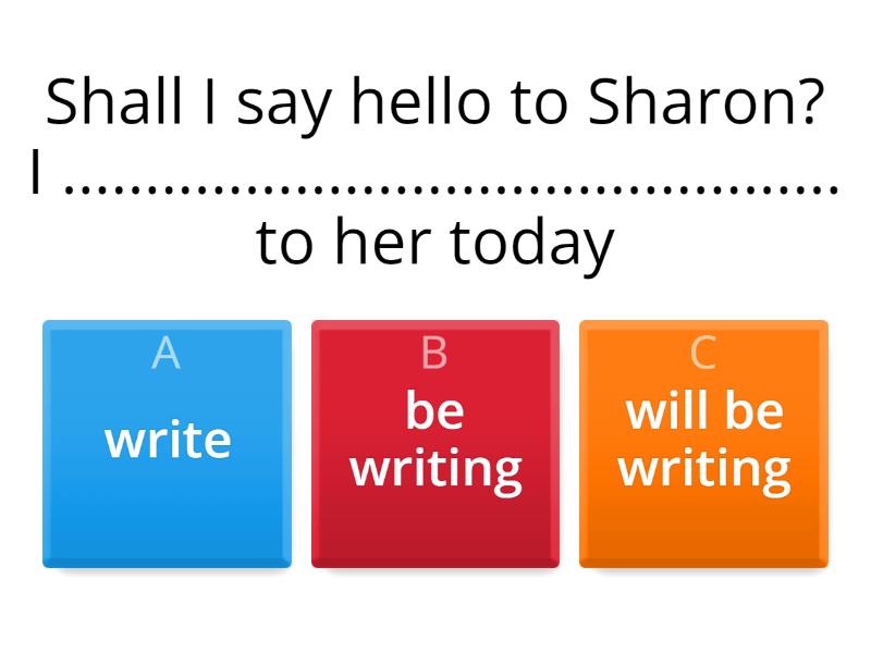 1) Shall I say hello to Sharon? I ............................................... to her today a) write b) be writing c) will be writing 2) Can I help you? I ............................................... you that blouse. a) will be showing b) will show c) won't show 3) Good Lord! The engine has stopped. - No problem. Bill ............................................... a look at it. a) a) is having b) b) will have c) c) will be having 4) Why don't you have dinner with us? I ............................................... anyway a) will be cooking b) am cooking c) cook 5) This time next week we ............................................... round the Aegean Sea a) sail b) will be sailing c) will sail 6) If you take three cassettes, you ............................................... one cassette free a) are going to get b) are getting c) will get 7) I ............................................... my work before they arrive. a) will be finishing b) finish c) will finish 8) By the end of this century everyone ............................................... English. a) will be speaking b) is going to speak c) speaks 9) I think I _________________________ to bed early tonight a) will go b) will be going c) go 10) Next week at this time we ____________ in the sun in Spain a) will be lieing b) will lie c) will be lying