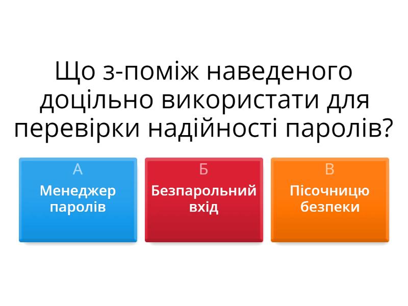 1) Що з-поміж наведеного доцільно використати для перевірки надійності паролів? a) Менеджер паролів b) Безпарольний вхід c) Пісочницю безпеки 2) Різновид багатофакторної автентифікації, яка грунтується на підтвердженні особистості користувача за допомогою двох незалежних один від одного факторів, – це: a) єдиний вхід b) двофакторна автентифікація c) фішинг 3) Комплекс процесів, практичних порад і технологічних рішень, які допомагають захищати важливі системи та мережу від кібератак, – це: a) кібергігієна b) кібербезпека c) кіберзагроза 4) Механізм, що обмежує вебсторінки та додатки, захищаючи Ваш пристрій, якщо Ви випадково натрапите на шкідливий контент, – це: a) ключ безпеки b) двофакторна автентифікація c) пісочниця безпеки 5) Уміння, навички користування інформаційними технологіями, спрямовані на здійснення заходів щодо своєчасного виявлення, запобігання і нейтралізації реальних і потенційних кіберзагроз, – це: a) кібергігієна b) кібербезпека c) кіберзагроза 6) Тип кіберзлочину, спрямований на отримання конфіденційних даних користувача, – це: a) DDos-атака b) фішинг c) єдиний вхід 7) Що входить до принципів інформаційної безпеки? a) Доступність b) Все перераховане c) Конфідеційність d) Цілісність 8) Розділ інформатики, що визначає закономірності захисту інформаційних ресурсів? a) Вірусологія b) Конфідеційність c) Інформаційна безпека 9) Забезпечення доступу до даних на основі прав доступу це? a) Доступність b) Цілісність c) Конфідеційність 10) Захист даних від зловмисного або випадкового видалення чи спотворення це? a) Цілісність b) Доступність c) Конфідеційність 11) Окремий пристрій чи спеціальні програми, які для захисту створюють бар'єр між комп'ютером і мережею це? a) Антивірусні програми b) Брандмауери c) Антиблокери 12) Програмний код, призначений для того, щоб пошкодити, передати, заблокувати або видалити дані називається? a) Троян b) Хробак c) Вірус