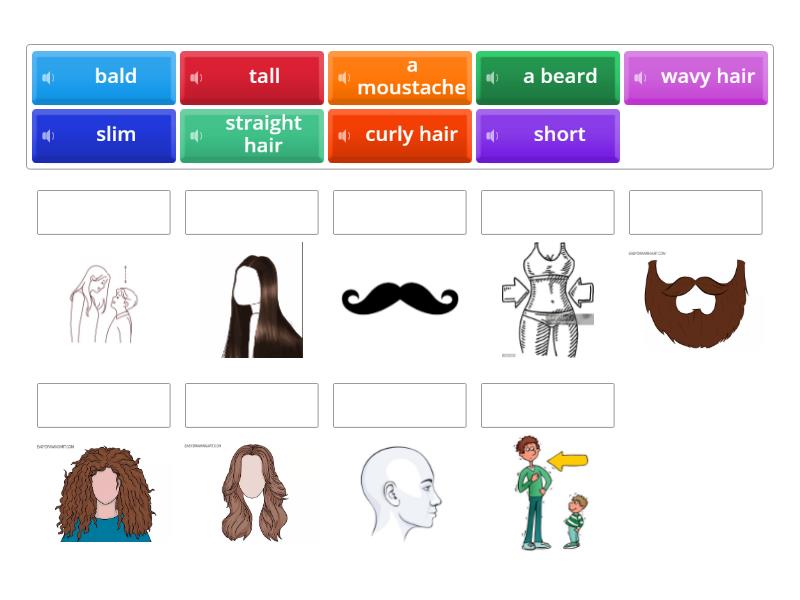 a beard, a moustache, curly hair, wavy hair, straight hair, tall, short, slim, bald,