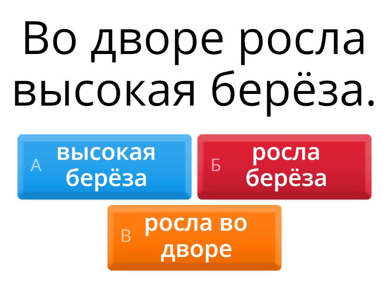1) Во дворе росла высокая берёза. a) высокая берёза b) росла берёза c) росла во дворе 2) За ней виднелся огромный дуб. a) виднелся дуб b) виднелся за ней c) огромный дуб 3) Позади стояла небольшая ива. a) стояла позади b) небольшая ива c) ива стояла 4) Весной этот скворечник заселили дрозды. a) заселили скворечник b) заселили дрозды c) заселили весной 5) Пушистые щенки дружно скатились с крыльца. a) пушистые щенки b) дружно скатились c) щенки скатились d) скатились с крыльца 6) Кошка лакала молоко из тарелочки. a) лакала из тарелочки b) кошка лакала c) молоко из тарелочки 7) Мама варила кашу из манки. a) мама варила b) варила кашу c) кашу из манки 8) Дети играли на детской площадке. a) играли на детской b) детской площадке c) дети играли 9) Бабушка вяжет шерстяной шарф. a) бабушка вяжет b) шерстяной шарф c) вяжет шарф 10) Папа каждый день ходит на работу. a) ходит на работу b) каждый день ходит c) папа ходит