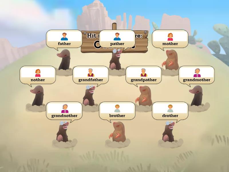 Correct: father, mother, grandfather, grandmother, brother, sister, friend, zebra, name:이름, sun, zoo, grandmother: 할머니, father: 아버지, mother: 어머니, sister: 여자형제, Incorrect: pather, nother, grandpather, grandnother, drother, cister, priend, gebra, mame: 이름, cun, joo, grandmother: 할아버지, father: 어머니, mother: 할머니, sister: 남자형제,