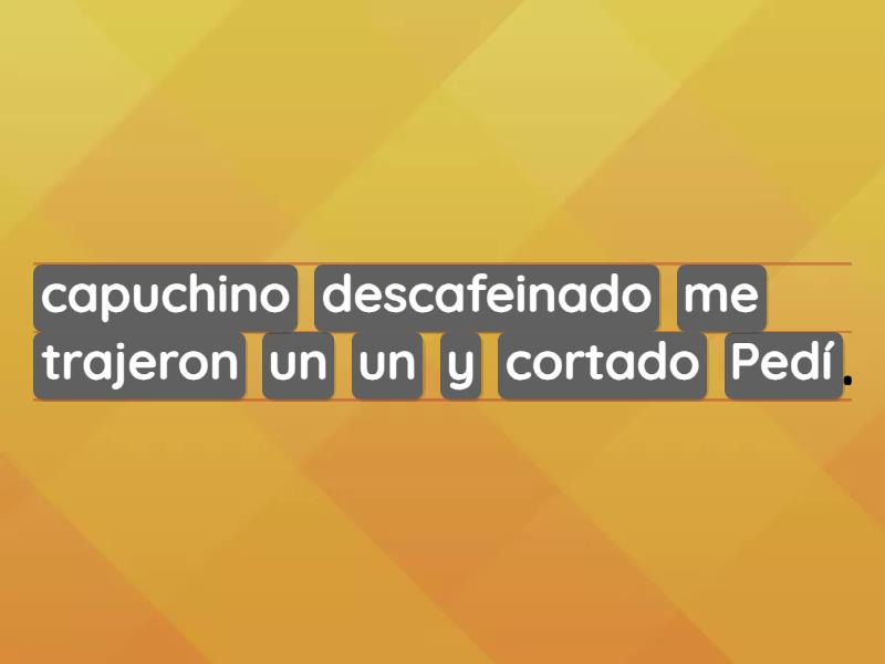 Pedí un capuchino descafeinado y me trajeron un cortado., Me da igual si pides pizza o sushi., Para colmo, me trajeron sopa fría., ¿Tenéis algo para la resaca?, Los uniformes del personal están desteñidos del sudor., Estás de suerte ya que hay platos vegetarianos en el menú., Los nuevos cócteles se venden como rosquillas., He traído de vuelta mi pedido, no me lo quedaba bien., Las suelas de estas botas no resbalan, son muy cómodas., Ayer me compré un vestido tan genial que no veas.,