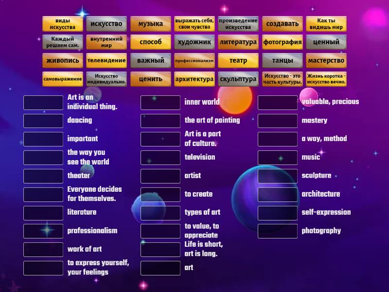 искусство - art, произведение искусства - work of art, художник - artist, мастерство - mastery, ценный - valuable, precious, ценить - to value, to appreciate, выражать себя, свои чувства - to express yourself, your feelings, важный - important, Искусство - это часть культуры. - Art is a part of culture., Искусство индивидуально. - Art is an individual thing., Жизнь коротка - искусство вечно. - Life is short, art is long., Каждый решаем сам. - Everyone decides for themselves., скульптура - sculpture, литература - literature, виды искусства - types of art, живопись - the art of painting, архитектура - architecture, музыка - music, театр - theater, телевидение - television, танцы - dancing, фотография - photography, Как ты видишь мир - the way you see the world, внутренний мир - inner world, профессионализм - professionalism, самовыражение - self-expression, создавать - to create, способ - a way, method,